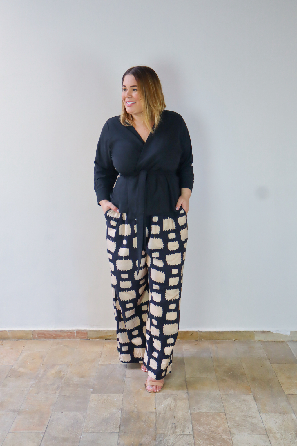 Sua estampa Square em tons preto e bege confere um visual clássico e versátil, perfeito para compor looks modernos. O design pantalona proporciona um caimento fluido e elegante, valorizando a silhueta.